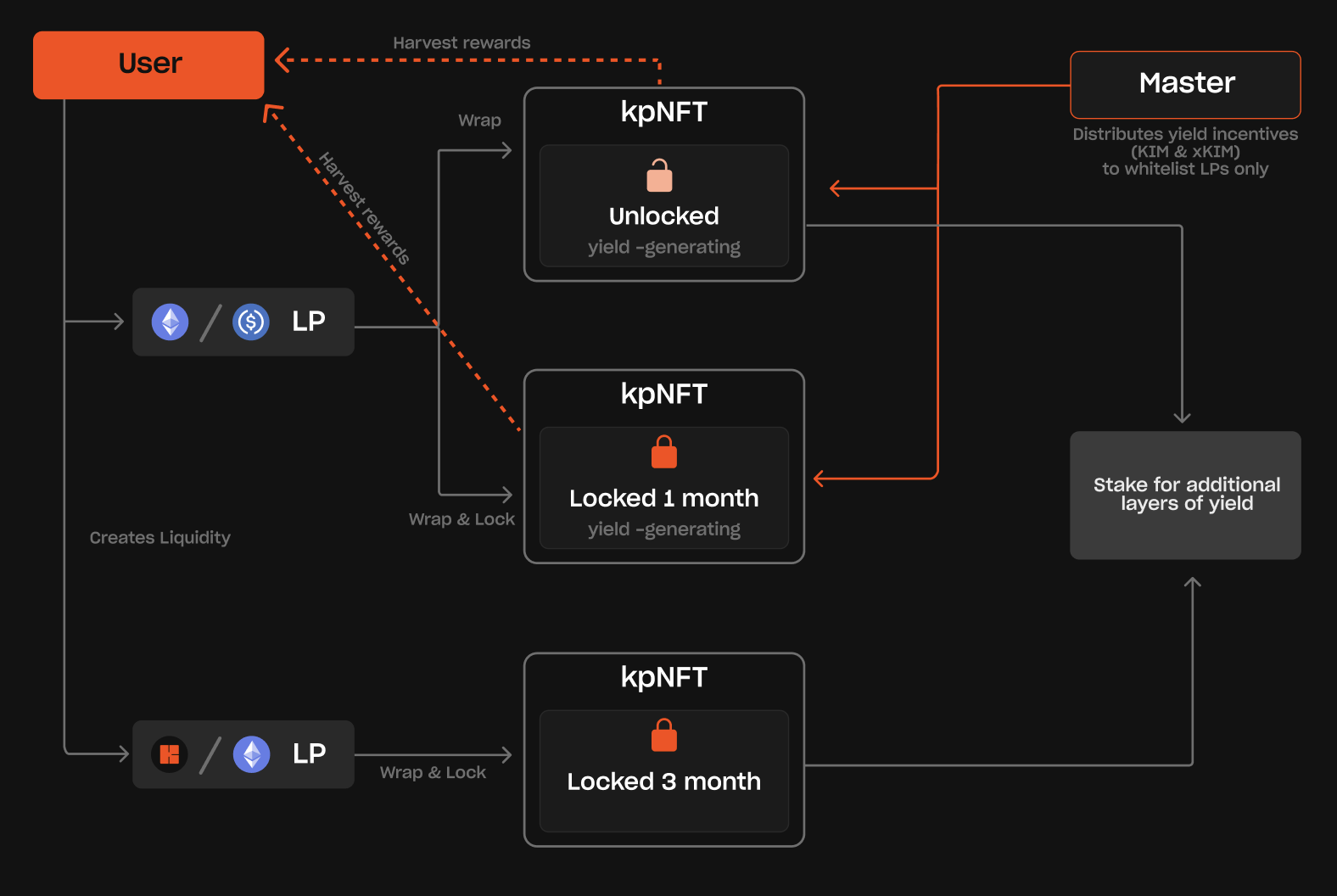 Each KIM LP has its own KIM staking positions (or kpNFTs) that users can mint by wrapping LP tokens (i.e. depositing them on the relevant contract).
